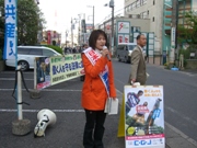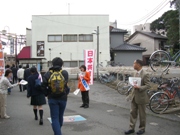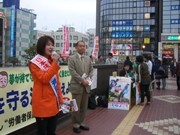 4月29日(火) ■宣伝カーから訴え日本共産党の斉藤和子県青年学生部長(衆院千葉4区予定候補)が、宣伝カーから船橋市内10ヵ所で訴えました。 右の写真はJR西船橋駅北口。 自ら農家に生まれた体験を踏まえて食料自給率の向上を呼びかけ、高齢者を差別する後期高齢者医療制度の中止、青年の雇用をはじめとして深刻な事態の中で税金の集め方と使い方を国民本位に、などについて話しました。 これには、金沢和子、中沢学、佐藤重雄、石川敏宏、関根和子各船橋市議も参加して、日本共産党の果たすべき役割を語り、志位和夫委員長を国会へ、と訴えました。 |
