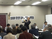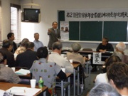 | 11月21日(土) ■国労江東支部の大会 国鉄労働組合江東支部(総武線・浅草橋駅から千葉駅や京葉線などの駅務員や運転手、車掌などで構成)の大会が開かれ、参加してあいさつしました。 民主党の政権になり、期待も広がったが、後期高齢者医療制度の廃止の先送り、沖縄の米軍基地の県内たらいまわし容認発言、12億円もの官房機密費継承など、期待に反するものもあり両面を持っていること、財源では扶養控除の廃止や消費税増税など国民への負担増でまかなおうとしていることなど、問題点が浮上してきていること、変わり始めた政治をさらに前へ進めるためには、国民運動の広がりが必要なこと、などを呼びかけて連帯を表明しました。 組合の報告では、1047人の不採用問題のたたかいへの呼びかけや、人員削減、子会社への業務委託などの合理化が、いかに利用者の安全を脅かしているかが語られていました。 この大会には、日本共産党の金沢和子船橋市議も参加してあいさつしました。 ■地域後援会の議会報告会 船橋市市場地域の日本共産党後援会が、議会報告会を開きました。国政の問題では、前向きと後ろ向きの両面を持っている民主党政権の姿がはっきりしてきたこと、県政では、不正経理や森田知事の違法献金、八ツ場ダムの建設、戦前の教育への回帰ねらう森田県政などについて、報告しました。 参加者からは、「八ツ場ダムは早く中止を決断して、住民の生活を考えるべきだ」「自分は77歳だから、子どもたちのためには、税金を支払ってもいい」「そうは言っても、税金は暮らしには使われていない。問題は使い方だ」など、活発な意見が出されました。 これには、金沢和子市議(写真正面右)も参加して、市政について話しました。 |